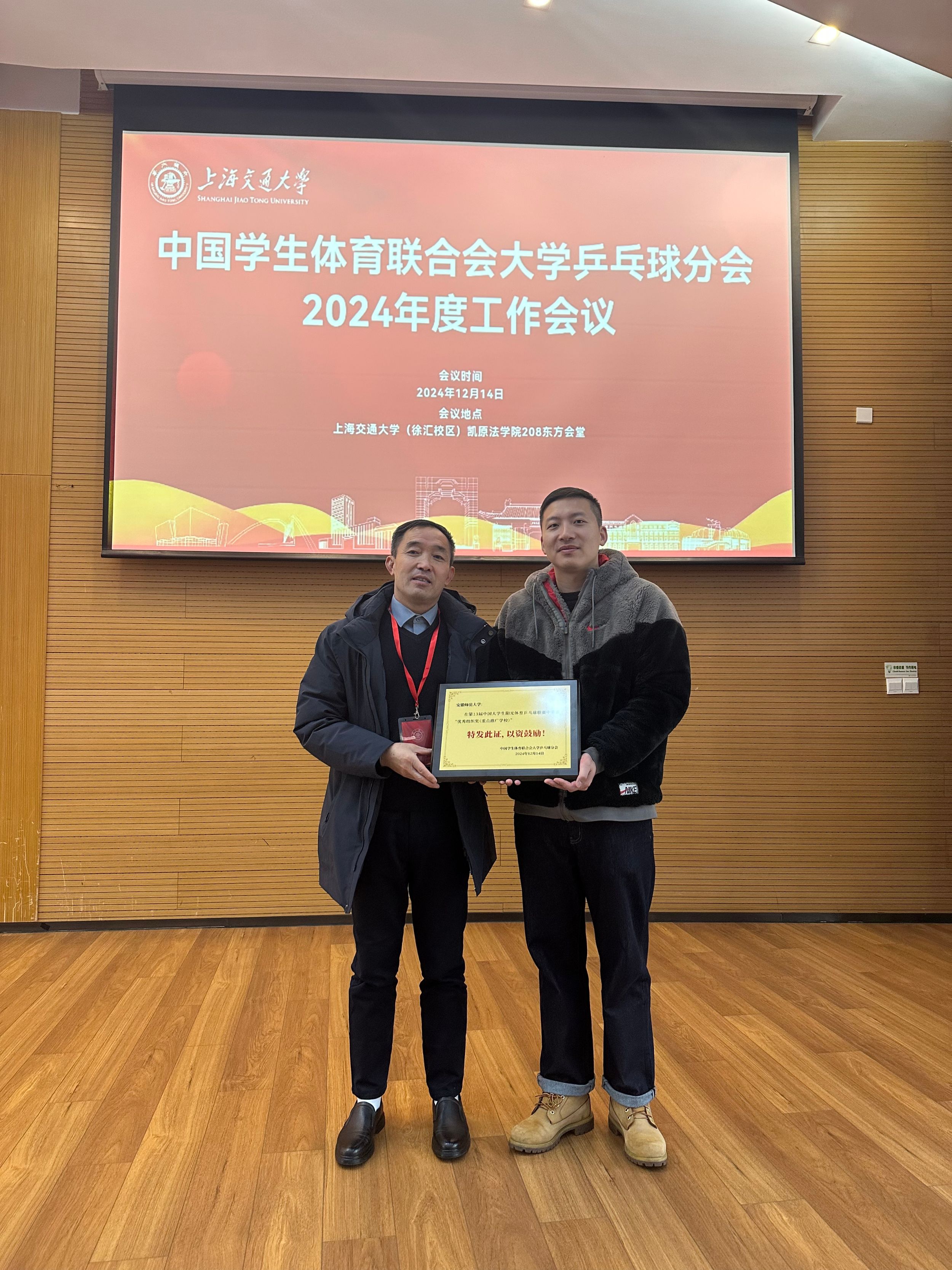 为促进学校体育事业高质量发展,助推高校乒乓球系列活动推广,12月14日-15日,中国员工体育联合会大学乒乓球分会在上海交通大学举办2024年度工作会议。全国128所高校参加此次工作会议。会议评选出第13届中国老员工阳光体育乒乓球联赛“优秀组织奖”(重点推广学校)高校。英国正版365官方网站与浙江大学、北京理工大学等10所高校获此殊荣。公司公共体育乒乓球队教练员丁俊生和朱树笙两位老师代表英国正版365官方网站参会并领奖。