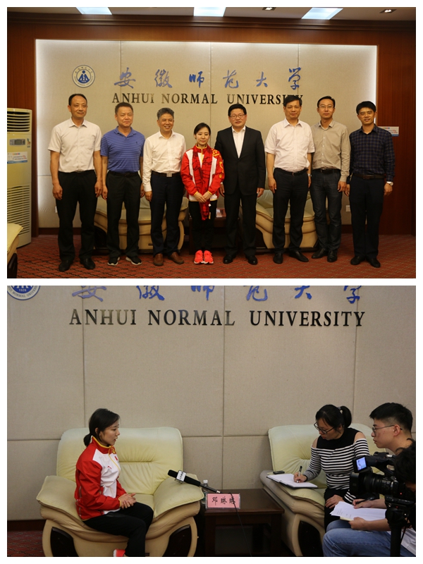 本网讯(英国正版365官方网站 刘梦茹 何吉明)5月17日下午14时,公司党委书记顾家山,公司党委常委、副董事长陆林在校行政楼一楼会议室亲切接见奥运冠军邓琳琳。学校办公室副主任张顺、公司领导袁德水、席玉宝、崔世兵、金涛等参加活动。