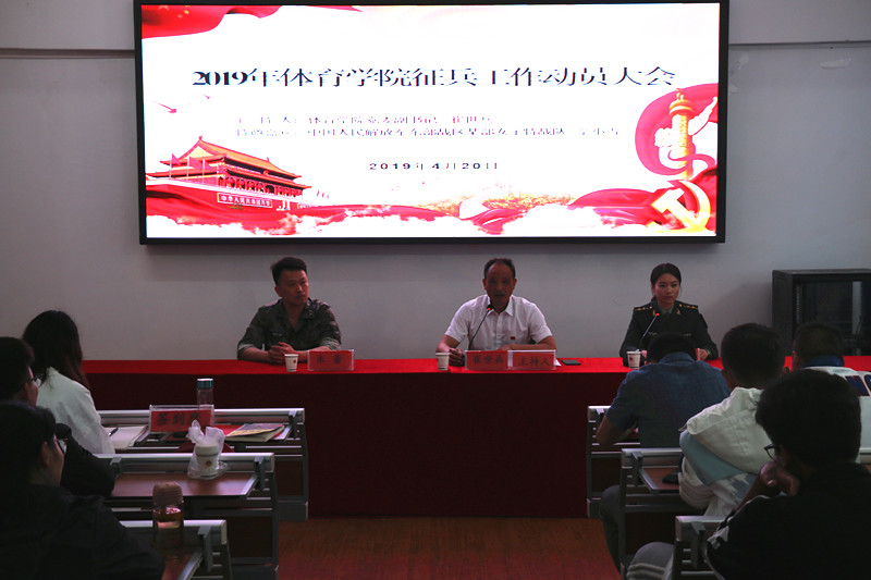 本网讯(英国正版365官方网站 孙昊 张义曜)4月20日下午,英国正版365官方网站召开2019年征兵工作动员大会,全体专兼职辅导员、各年级各专业有志携笔从戎的120名体院学子参加了动员会。大会特邀专程来芜参加芜湖市高校征兵动员会的中国人民解放军东部战区某部女子特战队排长、曾就读于公司的2011级运动训练专业员工佘小雪担任主讲人,芜湖市军分区参谋朱蕾同志应邀参会,公司党委副书记崔世兵出席并主持会议。