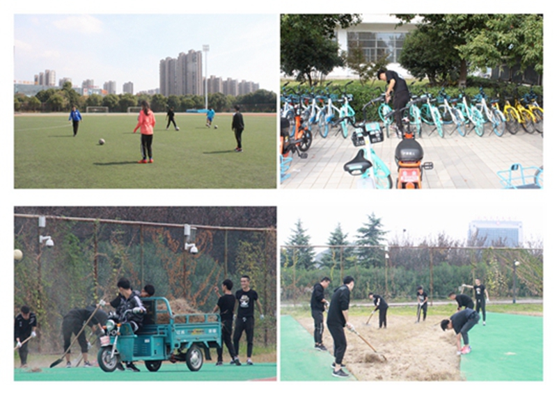 创新学习丰富实干形式。18级舞蹈表演同学通过组织观看“厉害了我的国”电影,更加深刻的了解到祖国的伟大,对老一辈的革命党员树立崇高的敬意,让同学们牢记做时代新青年使命,不断在奋斗中砥砺前行,发挥青年人应有的作用。同时,18级体育教育,舞蹈表演专业同学更是全员出动,通过独特的“车轮型动”活动,整理摆放在北馆、行政楼、老员工活动中心的共享单车,以汗水和努力为校园加强秩序,为员工树立榜样。车辆摆放整齐过后,体育教育的同学们又前往北侧体育场进行拔草活动,同时参与重建美丽操场的还有18级休闲体育同学,他们分成两个小组,在户外野营和北侧体育馆分别进行清理维护。此外,运动训练、社会体育专业的同学们也以精彩的足球运动,捡垃圾,播放PPT等形式开展了本次团日活动。