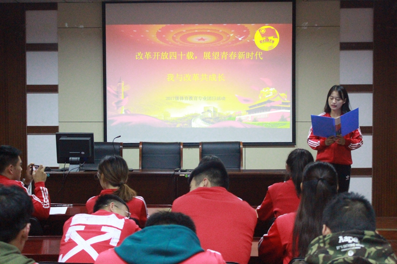 10月13日晚7点,2017级社会体育指导与管理专业全体团员于英国正版365官方网站二楼会议室召开“我与改革共成长”主题团日活动。活动开始,由17社体团支部书记刘勇同学上台致开场词并介绍本次团日活动。随后,在刘勇同学的主持下观看《厉害了,我的国》纪录片,1978-2018,坚持改革开放,不断加大改革开放的深度、广度,中国正逐渐强起来。四十年艰苦奋斗,17社体的同学们吃水不忘挖井人。全体团员的为改革开放四十年录制视频,为伟大的祖国送上祝福。在行动上积极主动的向学习团的知识,努力向党组织进行靠拢,在思想上坚持中国共产党的领导,紧跟党的步伐,做一个合格的共青团员。举办“我与改革共成长”团日活动的还有2017级体育教育专业以及2017级运动训练专业、2017级休闲体育专业团支部。他们以自己的形式去追寻改革开放,学团史、树团情,在历史中回味改革开放的时代意义。