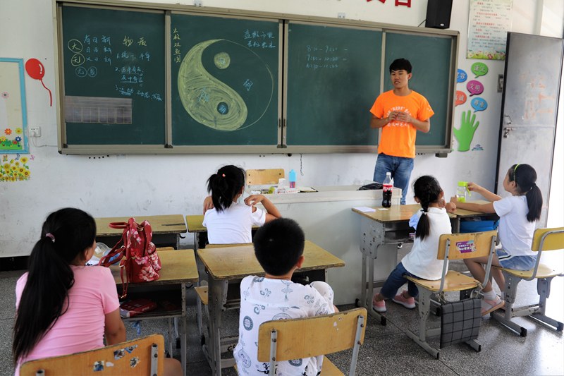 武术班的教学老师钟志浩有着一个六个人的武术小班,在支教活动的七天里,他教会了孩子们一套“五步拳”,看到员工们拳打得有模有样,他也感到十分高兴。每天晚上送完小孩子们回家之后,他坐在办公室里准备明天的教学计划、写今天的总结,把每一个教学活动都安排仔细,认真负责的去教好每一个小朋友们打拳。在日常的教学活动中,他和小孩子们的互动也非常频繁。在武术班上有有一个跳拉丁舞非常棒的小女孩,有时他和这位小朋友也会相互“切磋”他们的舞艺,在平时聊天中,他发现班上那个看起来最小的女孩也是多才多艺,在夏令营文艺汇演中弹了一首电子琴,也赢得了现场观众的掌声。
