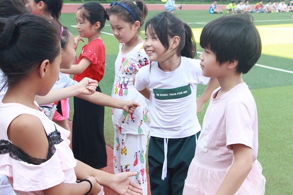 在早上的素质拓展活动时,志愿者老师吴秦宇与孩子们一起玩游戏,制订了由鸡蛋变成小鸡进而变为孔雀、大猩猩,最终变成人的游戏规则,让孩子们石头剪刀布去进行“比拼”,赢的人则到前面来和老师进行击掌。志愿者老师吴秦宇告诉记者说:“开展这个活动一方面是为了锻炼孩子们的体质,另一方面则是为了破除老师和员工之间的坚冰,促进同学们和师生之间的交流”。活动过后,一位小女孩开心的说道:“去年的夏令营我也参加了,今年的活动一样很好玩!”