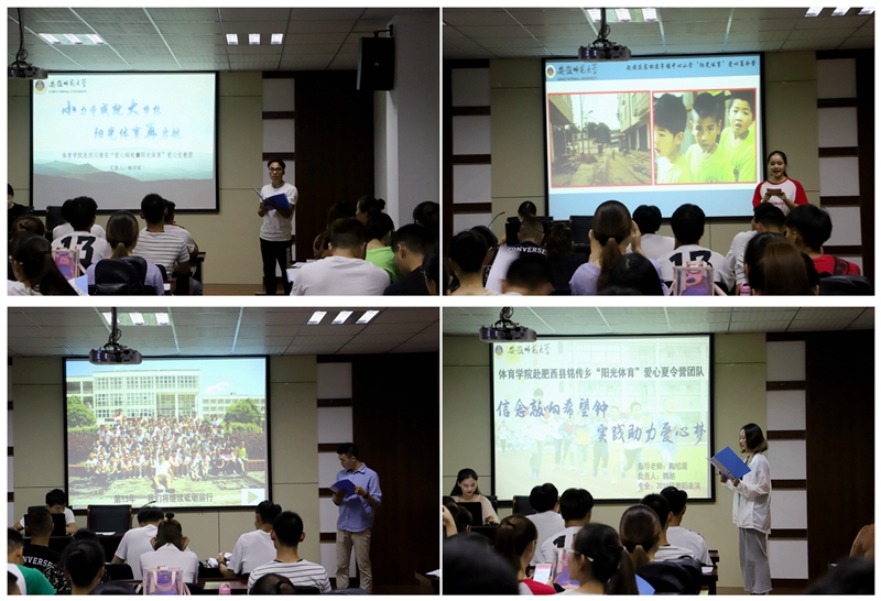 经过学院初审和遴选,共有23支队伍通过参加本次汇报来竞选学校重点团队。每支队伍按照事先的抽签顺序,通过ppt演示,围绕着“阳光体育”的中心主题,分别向评委老师们展示了团队的实践地点、活动主题、团队成员、活动准备、实践内容以及预期取得成果等方面的内容。不仅要读万卷书,还要行万里路,无论是赴宣城溪口小学爱心夏令营,还是赴黄山区甘棠中心学校爱心夏令营,23支队伍通过自己所学,将理论转化为实践,把实践活动深入到基层,尽力给孩子们送去一个欢声笑语的夏天,让实践活动更出彩、更有意义。