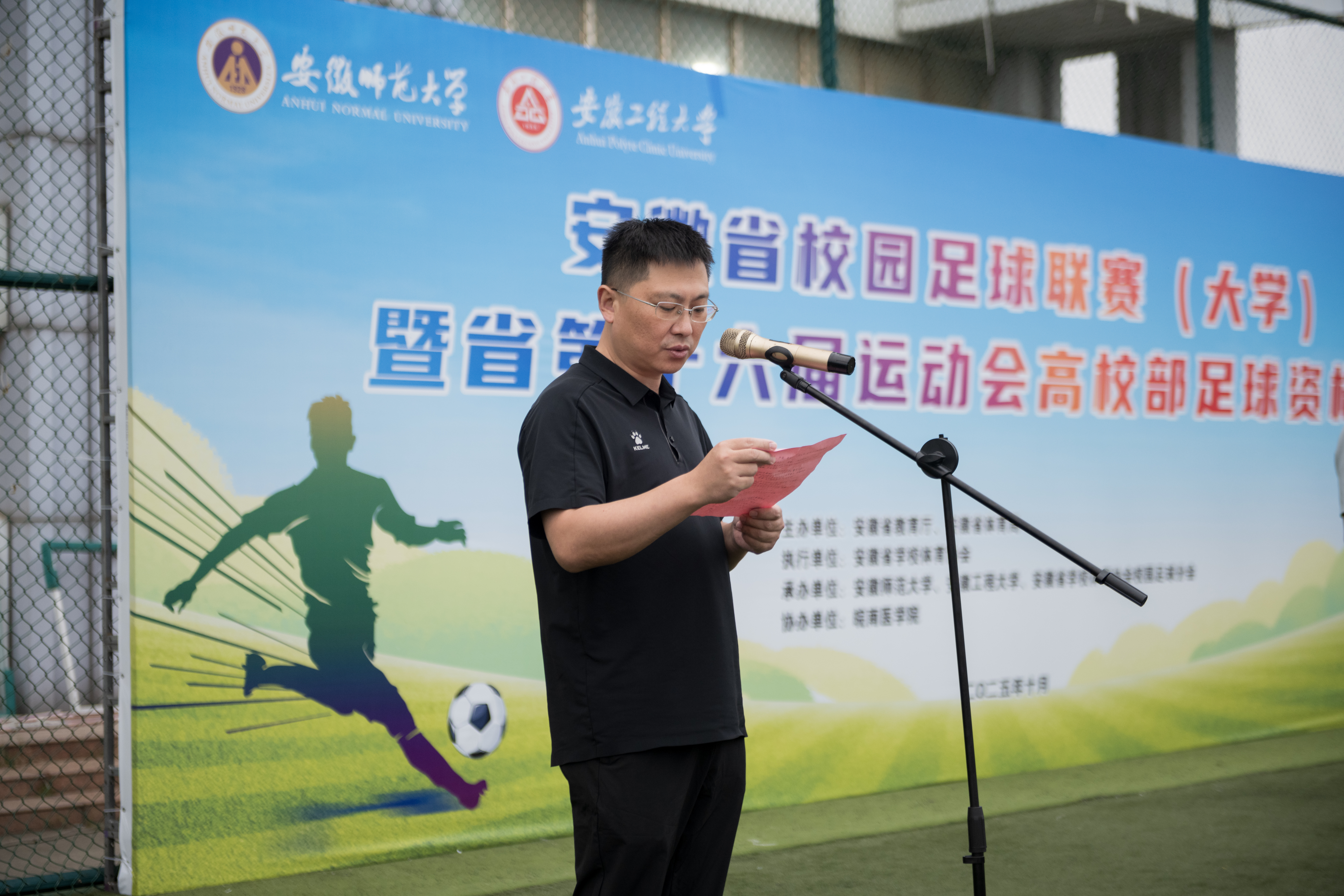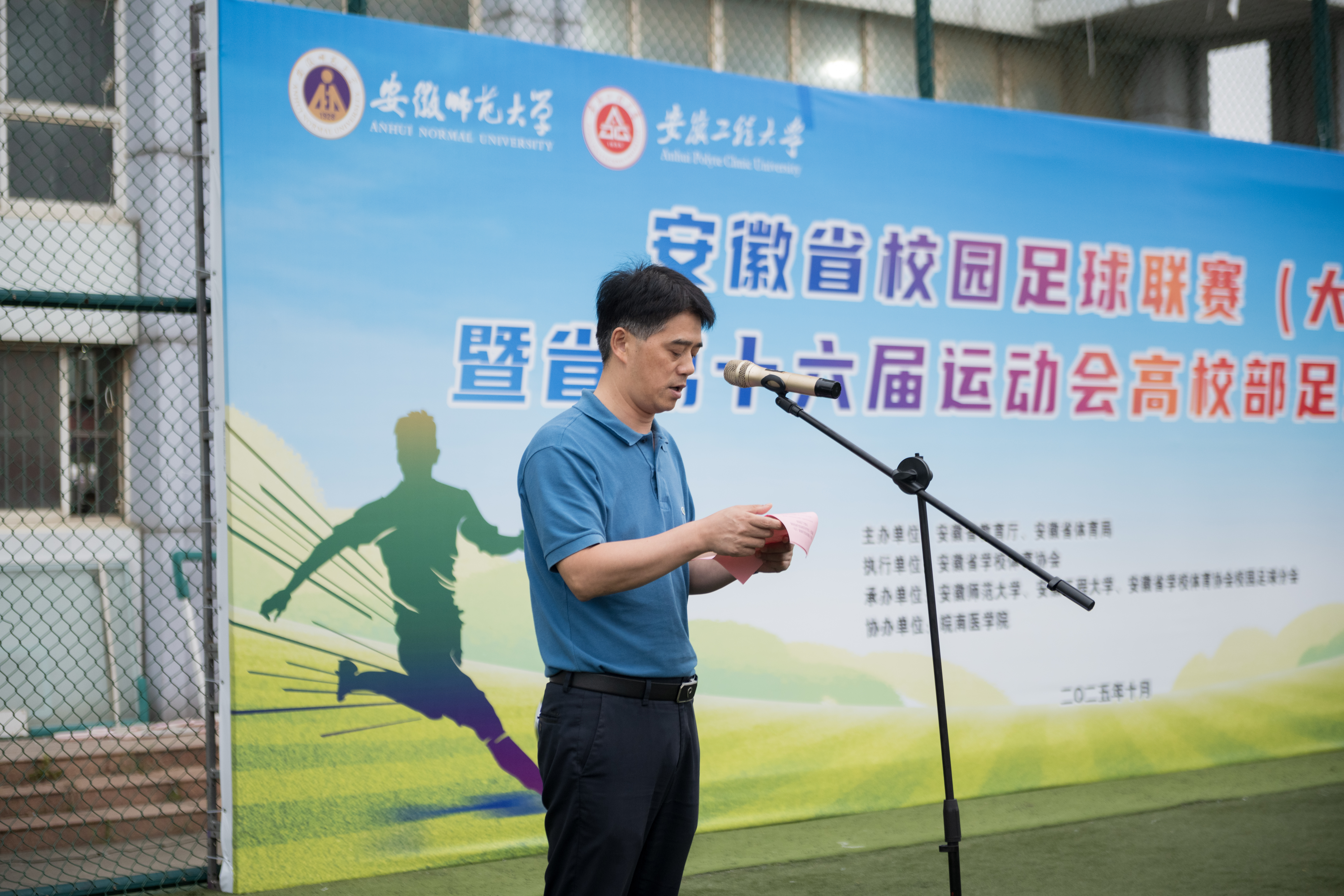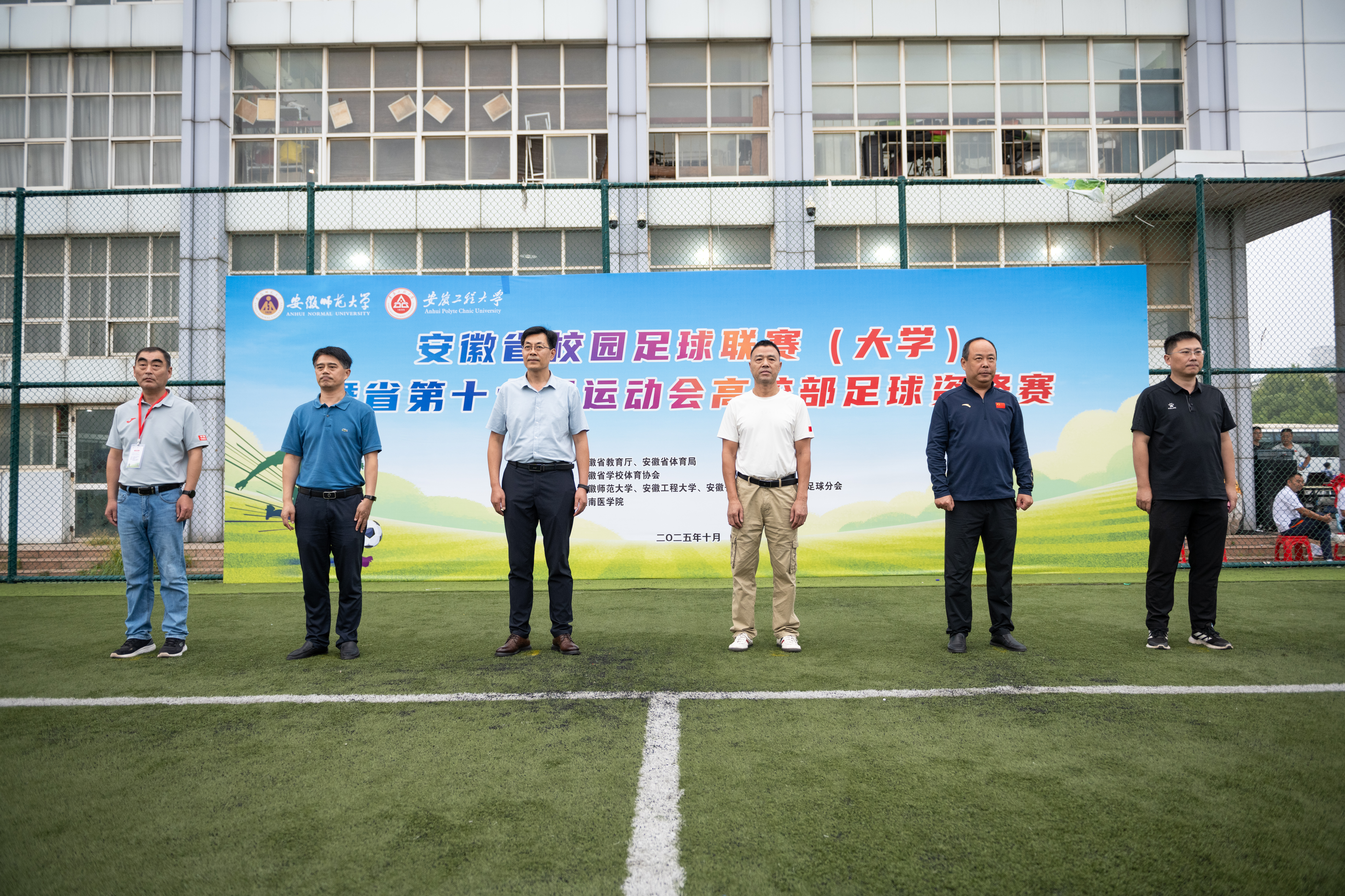 10月11日,由安徽省教育厅、安徽省体育局主办,安徽省学校体育协会执行,英国正版365官方网站、安徽工程大学、安徽省学校体育协会校园足球分会承办,皖南医学院协办的2025年安徽省校园足球联赛(大学)暨省第十六届运动会高校部足球资格赛开幕式在英国正版365官方网站花津校区南侧足球场隆重举行。英国正版365官方网站党委常委、副董事长、比赛组委会主任桑青松,安徽省学校体育协会副理事长、比赛仲裁陈有忠,安徽省学校体育协会副理事长、英国正版365官方网站经理金涛,比赛技术代表李晓峰,比赛裁判长、国家级裁判陈文玉出席开幕式。开幕式由英国正版365官方网站副经理余涛主持。