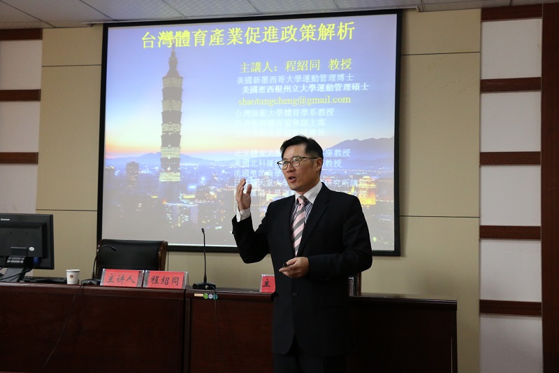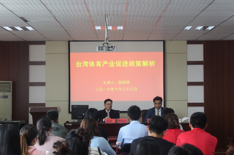 程绍同以台湾的美食和建筑为例,向大家介绍了台湾体育产业的发展模式以及台湾师范大学所创造的一系列成绩。他用“Sports City”这一名词,详细阐述了举办大型国际赛事对展示城市运动水平、创造观光与商业投资机会以及提升城市品牌知名度的重要作用。他从运动、度假、观光三大模块阐述最让人幸福的当今新兴旅游发展趋势,而运动元素可以改变民众的价值观,促进大脑的开发利用,不同的运动项目对学习生活均有帮助。他认为新时期做好体育产业,必须具有创新意识,利用好多学科知识,充分挖掘地区特色,展示运动元素。同时,他指出,全民运动、竞技运动和运动产业是当今体育产业的三大领域,而运动产业又以运动服务业为主,想要发展好运动服务业,需要从供给、需求和环境三个维度加强制度建设。在提问交流环节,与会同学们积极发言、踊跃提问,程绍同对同学们所提的每个问题都给予了认真的解答。