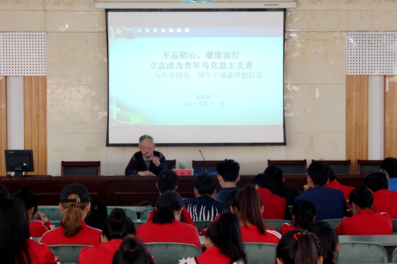 袁起河首先从党的十九大报告展开叙述。他强调,中国共产主义青年团是中国共产党领导的先进青年的群众组织,是广大青年在实践中学习共产主义的学校,是中国共产党的助手和后备军。全体共青团员要时刻听党的话、永远跟着党走。之后,袁起河又谈到中国共产党的优越性,他表示中国共产党在发展中与时俱进,并始终高举中国特色社会主义伟大旗帜,在不断改革创新中,保持着党的先进性;在日益完善自身中,保持党的纯洁性。而身为中国共产党的后备军,共青团员更应当从自身做起,从小事做起,严于律己,做优秀的“四有”青年,思想上主动靠近党组织,行动上要紧跟共产党员的要求,甚至做不是共产党员的共产党员。最后,作为老党员和老团干的袁起河建议大家:要认真学习马克思列宁主义、毛泽东思想、邓小平理论、“三个代表”重要思想和科学发展观,特别是要认真学习贯彻习近平新时代中国特色社会主义思想,坚定理想信念,矢志艰苦奋斗,努力为建设中国特色社会主义现代化强国、为实现中华民族伟大复兴的中国梦贡献自己的青春和力量。