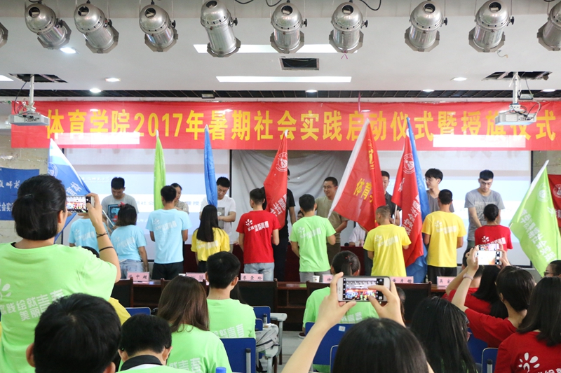 校团委、学院领导和指导老师代表为重点实践团队代表授旗。