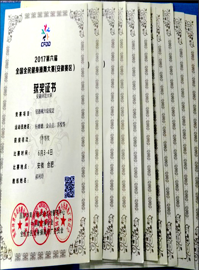本网讯(英国正版365官方网站 左宗玲)6月3日至4日,2017年第六届全国全民健身操舞大赛(安徽赛区)的比赛在安徽省粮食工程学院举行。公司由14级体育教育健美操专选班、15、16级体育表演专业组成的英国正版365官方网站代表队,分别获得轻器械六级、轻器械四级、爵士舞三项特等奖、自选套路一等奖的好成绩。
