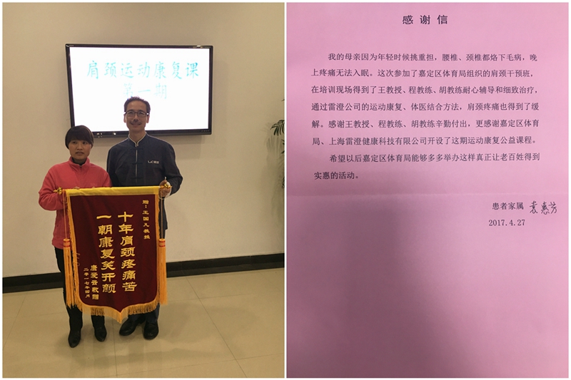 本次线下公益课,由上海市嘉定区体育局网上公开招募,来此学习的学员大多带有亚健康问题。王国凡教授和他的专业研究生们为来此学习的部分学员进行了一对一的身体功能评估与运动康复服务。学员在被动康复后再进行约30分钟的针对性运动康复训练,其目的为提高自身体能,稳定康复效果。康复的学员中有10余年颈肩问题的企业高管康女士,有长期被失眠困扰的中年职工李女士和成沓病例的退休袁阿姨等。在经过系统体能康复训练后,康女士的肩颈疼痛几乎完全消失,两肩活动轻松灵活;康复后的李女士,经历了几年来最好的睡眠,而袁阿姨更是觉得颈背不再疼痛,能够挺直站立。相较于一般的按摩与理疗短暂放松,通过自主运动康复后的效果更明显、更持久。感觉到效果的神奇,有的学员甚至将自己的爱人和亲戚也带来学习。