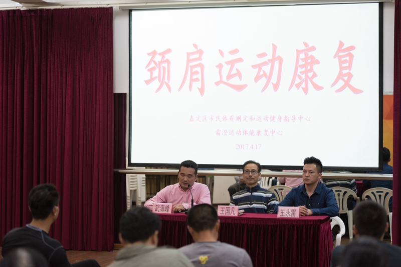 2017年4月17日,王国凡教授开启了上海市嘉定区体育局举办的“运动体能康复线下公益课”。本次公益课内容以颈肩康复为主,从“体医结合”的角度,专业剖析现代人生活中普遍的健康问题,揭示现代人生活习惯、健康认知的偏差;阐释医院治疗与运动康复的良性互补和本质区别。王教授将自己创编的《颈肩保健康复操》进行了现场教学,对部分学员进行了身体功能评估,让学员清楚地认识到自身亚健康问题的存在,并针对问题进行了分析,提出了运动康复的思路和方法。整个教学过程传递了运动康复的科学性、必要性以及体医结合的新理念。