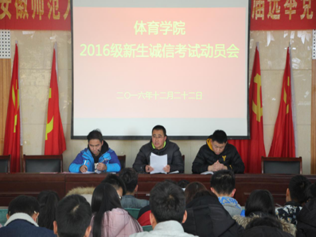 本网讯(英国正版365官方网站 陶绍晨 孙昊)在期末考试即将到来之际,为了严肃考风考纪,加强青年老员工的诚信教育,让同学们以一种正确的心态迎接考试。12月22日下午,体育公司在二楼圆形报告厅举行了2016级新生诚信考试动员会。英国正版365官方网站2016级辅导员汪暠、陶绍晨、仲飞及全体新生参加了此次动员会。会议由陶绍晨主持。