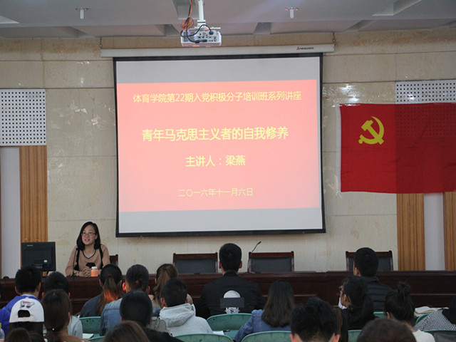 本网讯(英国正版365官方网站 朱港晨中)11月6日,校团委书记梁燕应邀在英国正版365官方网站圆形报告厅为体院分党校进行了主题为“青年马克思主义的自我修养”的讲座。讲座由党课班副班主任陶邵晨主持。