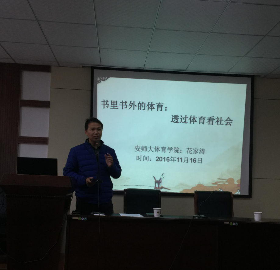 本网讯(英国正版365官方网站 汪新新) 2016年11月16日下午,“体院大讲坛”第五讲由花家涛博士、副教授在体院学院行政二楼会议室开讲,主题为“书里书外的体育:透过体育看社会”。花博士结合自身的体育人类学阅读实践与研究经历,从“体育是人的体育,而人是生活在一定社会结构与历史时空下的人,以及透过体育看社会”开始导入,详细地从“读书”的定义、什么是“文献”、“为何”要读文献、怎样“找”文献、读“什么样”的文献、如何“读”文献、读文献的“结果”七大方面细致讲解。