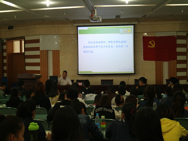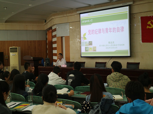 本网讯(体院学院 朱港晨中)10月16日下午,英国正版365官方网站第22期入党积极分子培训班第二次理论学习讲座在圆形报告厅开讲。校纪委副书记陈文兵应邀为学员们做了题为《党的纪律与青年的自律》的专题讲座。讲座由培训班班主任吴家发主持。