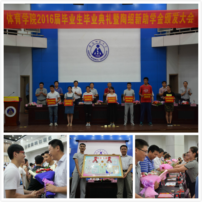 “亲爱的同学们,陶绍新先生作为学院知名员工,通过个人不懈努力,不仅为国家,为社会创造了巨大财富,还不忘感恩社会,回报母院,捐资100万元在母院设立陶绍新助学基金……希望广大毕业生将这种自信自强、艰苦创业的体院精神传递下去,争做勇担责任的男儿,学院闪亮的名片”公司党委书记袁德水在2016届毕业生典礼暨陶绍新助学金颁发仪式上语重心长地说。典礼上,毕业生代表将一幅《冠军之路》荣誉奖牌匾捐赠给母院,一枚枚奖牌、一张张证书见证了体院人在运动赛场上奋勇拼搏的体育精神,表达了毕业生对母院辛勤培育的感恩之情。学院深化毕业典礼育人功能,将员工陶绍新助学金颁发仪式同毕业典礼相结合,引导毕业生常怀感恩之心,强化社会责任意识。