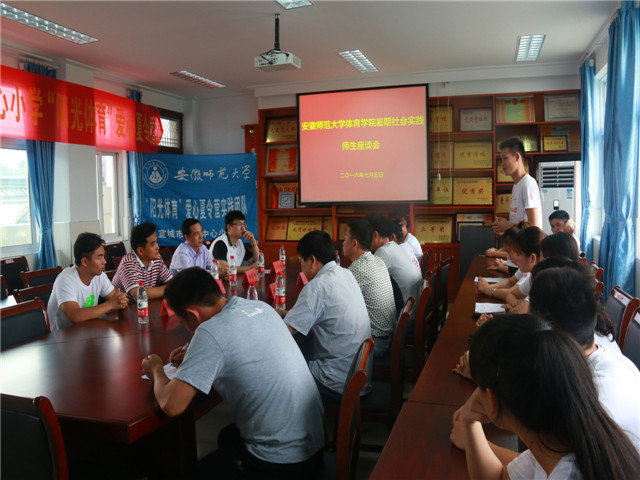 座谈会伊始,团队成员们依次谈了个人实践的感悟。其中,团队负责人杨帆代表发言,他说道从前期准备到队伍的最终建立,要感谢每一位队员的努力付出,同时提出作为校重点团队,压力与责任并存,面对接下来的每一个环节都不能懈怠。接着,副经理高升强调了打造“第三课堂”的重要性,更强调了学校对人才培养的重视以及暑期社会实践的必要性。他指出“参与一次,收获一次,成长一次。”要在保证安全的前提下秉承“自强不息、追求卓越”的师大精神,用心并毫无保留的对支教地区的孩子们贡献出自己的力量。接着,戴兆国老师在肯定了“阳光体育”爱心夏令营团队的支教成果后,也结合自身的经历故事指出了农村教育不容忽视,同时鼓励大家在实践中要多亲近自然、亲近人,没有切实的体验感悟的人很难在社会中发挥自己的作用。他还勉励志愿者们还要读自然、社会、报刊、心灵这“四书”,将厚德、重教、博学、笃行的师大校训发扬光大,最后他也表达了对当地校方的感谢。