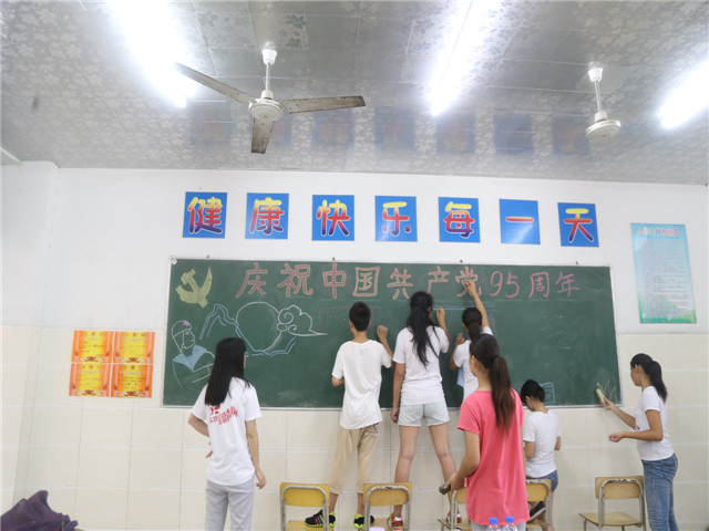 在精彩的讲座过程中,深受鼓舞的孩子们答应为亲爱的党出一期特别的板报。他们的热情丝毫没有受到天气的影响,大家都充满斗志,分工明确,大家画画、写字各司其职,还请来了两位美术老师为大家指导。有付出就会有回报,仅仅一节课的时间,孩子们就完成了黑板报的制作,看着大家稚嫩的笔触,天真的笑脸,所有的老师们都觉得开心溢于言表。