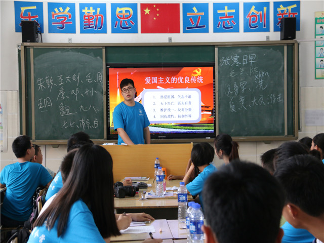 2016年7月10日周日,因为台风尼伯特的原因,安师大体院赴肥东县为民学校“阳光体育”夏令营的活动只能改到室内进行,我们的志愿者老师们带着孩子们上了一堂生动的爱国主义班会。班会上,老师教孩子们唱《黄河大合唱》,向大家介绍这首歌曲的背景,介绍它的词作家和曲作家,介绍歌曲背后不平凡的故事。爱国主义是我们从小就接受的教育,但是真正的了解却很少,班会上,老师们为孩子们深刻讲述了爱国主义的精神内涵,带领大家学习中华人民共和国各代领导人的爱国名言,和大家一起再度重温蔚为壮观的阅兵仪式……在这简单的活动中,孩子们的小脑袋频频点头,爱国主义的种子已经无形中在他们心中生根发芽。