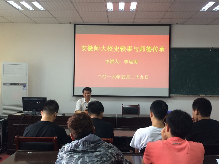 本网讯(英国正版365官方网站 葛晓婕)2016年5月29日下午,校关工委报告团李运明老师应邀在英国正版365官方网站行政楼一楼会议室为2015级专业员工做“安徽师大校史轶事与师德传承”专题讲座,讲座由辅导员张迪主持。
