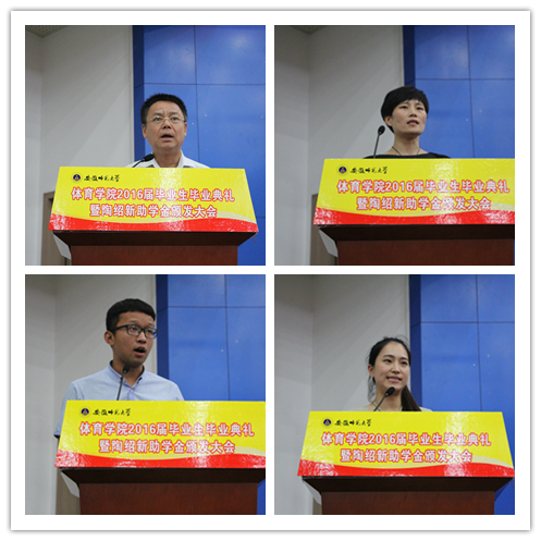 在慷慨激昂的的国歌声中毕业典礼拉开帷幕。舞蹈表演专业负责人陈建霞老师代表教师为毕业生寄语,她希望毕业生们将“仁爱留在心间”、在未来的挑战中将“坚强抗在肩头”、在回忆往事时要将“感恩藏于胸怀”。2013级体育教育专业严伟同学作为非毕业生代表致欢送词,祝师兄师姐在今后的学习和工作中一帆风顺、大展宏图;2016届毕业生、安徽省十佳老员工方萍同学代表毕业生致答谢词,表示在今后的生活中一定牢记老师们的教导,积极进取,开拓创新,用实实在在的业绩回报母校的培养和领导、老师们的教导。