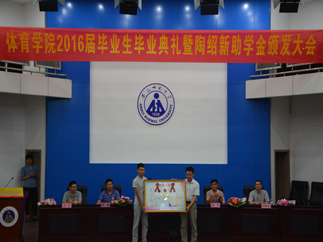 毕业典礼结束后,学院举办了第四届陶绍新助学金颁发大会,校教育基金会秘书长方百盈宣读了颁发决定,马鞍山精诚置业有限公司总经理谷开宝及领导老师向受助员工代表颁发陶绍新助学金。受助员工代表刘晓代表全体受助员工向陶绍新先生表达了深深谢意,并表示将会继续努力学习,日后一定会用自己的成绩来回报学校和社会的关爱。最后,谷开宝表示青年员工是社会的希望,他希望同学们要树立自强不息的信念,怀着对祖国和社会的感恩之前努力学习,将感恩之心化作甘露去滋润更多的人。