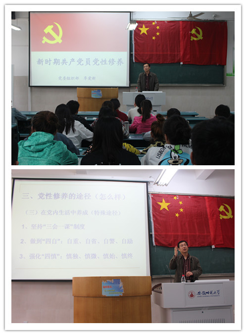 季爱新主要从三个方面对讲座主题进行了阐述。即什么是党性修养,为什么加强党性修养,怎么加强党性修养。季爱新首先向党员们介绍了党性原则、党性方面的基本要求,以及党性修养的涵义,并以周恩来总理为例,向同学们详细列举了伟人的七条个人修养。季爱新提出,要不断进行自我教育、约束和改造。
