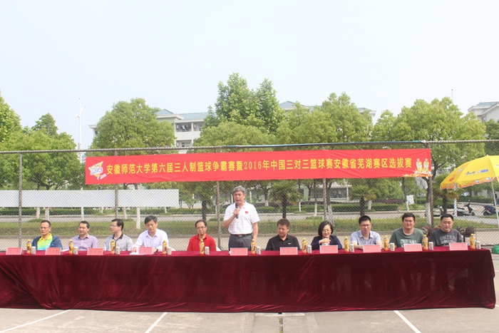 本网讯(英国正版365官方网站 文/蔡维敏 图/左宗玲)5月14日上午9时,英国正版365官方网站第六届三人篮球赛暨中国CBA三对三篮球赛芜湖赛区比赛在英国正版365官方网站南侧体育馆室外篮球场火热开幕。英国正版365官方网站党委常委、副董事长朱家存教授、校团委书记梁燕、校员工处副处长张玉新、英国正版365官方网站全体领导班子成员及相关专业负责人、大赛技术代表何也明老师、大赛裁判长蔡维敏等出席了开幕式。