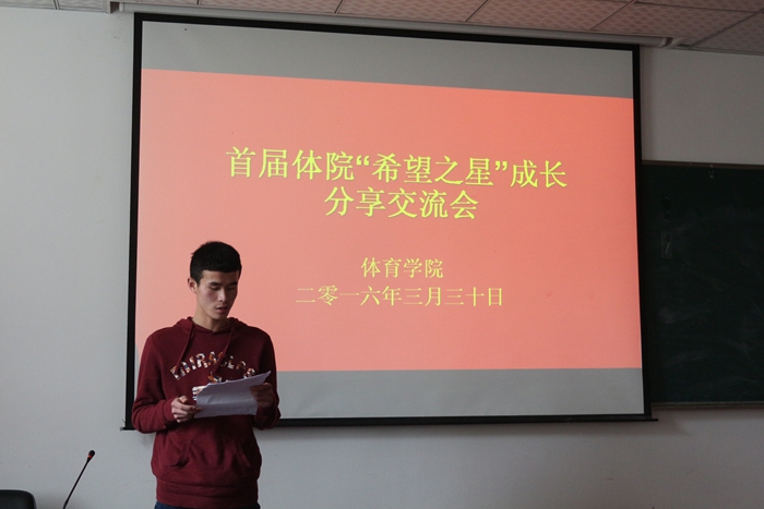 本网讯(英国正版365官方网站 朱港晨中)3月30日中午,首届“体院希望之星”成长分享交流会在行政楼一楼研究生教室如期举行。15级全体专业同学代表参加交流。辅导员吴家发、冯中超、张迪及新生班主任担任评委。