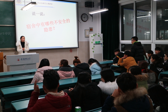 班会上,张老师首先提出,冬季来临,班级同学应该注重哪些安全隐患,并与同学一同讨论宿舍的安全重要性;其次,张老师以提问方式指出,在我们老员工的宿舍中存在哪些安全隐患,并引出违规物品等问题;其后,张老师利用丰富的PPT课件,生动形象地表明使用违规电器对个人生命安全带来的隐患,并结合《英国正版365官方网站员工手册宿舍管理规定》喻之以情晓之以理,让同学们加强了安全用电意识。最后在班会结束之际,在此强调并要求同学们贯彻落实“离校登记制度”、“请销假制度”、“校外住宿审批制度”、“零点不归报告制度”等四项务必执行制度,并强调任何情况,要第一时间与辅导员联系,保证所有安全隐患第一时间排除。