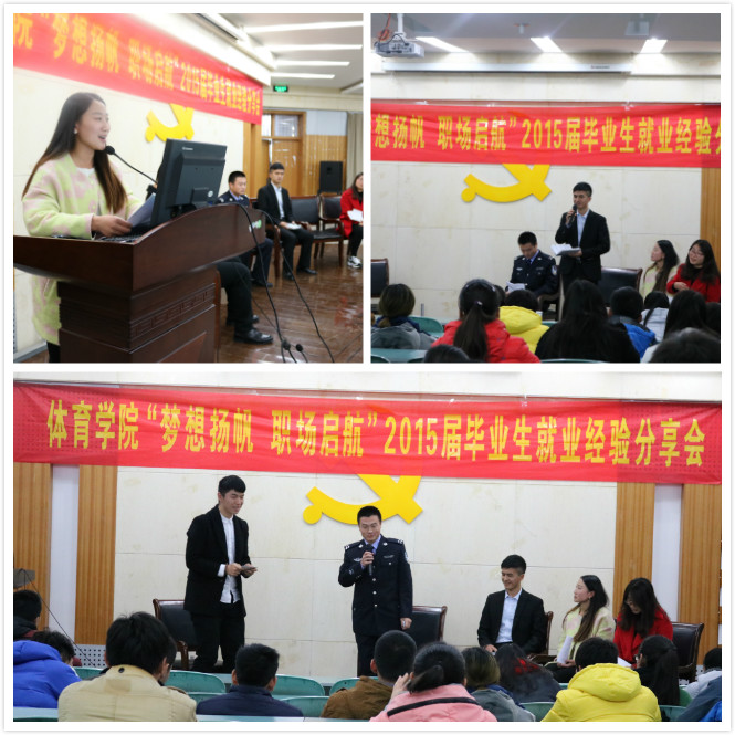动员会后,学院举办了“就业面对面”求职经验分享会。学院邀请的2015届优秀毕业生刘莉芳、焦林林、孙瑶瑶、石海平分别就教师招考、公务员应试、自主创业和体育方向等就业创业经历与即将毕业的学弟学妹们进行了面对面的经验交流,四位优秀毕业生为在场同学提供大量就业实用信息,鼓励同学们认准当前就业形势,做出适合自己的就业选择,并建议同学们根据自身情况制定“求职时间表”,随时更新求职动态,选择好的平台,激发自身潜能,做到有备无患.