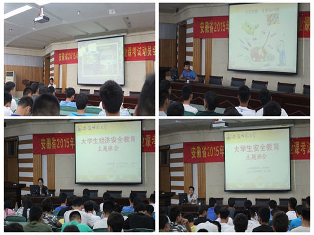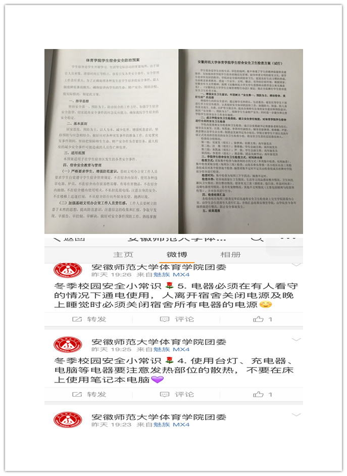 同时,学院通过多种渠道开展综合安全宣传工作。开学初,学院结合新生入学教育、党员培训,举行安全教育专题报告,组织新生校纪校规模拟考试、心理测评,增强新生安全防范意识。各班级召开安全知识主题班会,让员工安全教育真正入脑入心,将安全教育与主题活动相结合,制作教室板报,构建良好学习环境的同时,普及交通安全、寝室安全、心理健康、传染病防控等安全知识。充分发挥新媒体力量,在学院微博微信公共账号推送校园安全小贴士,确保校园安全信息全覆盖。