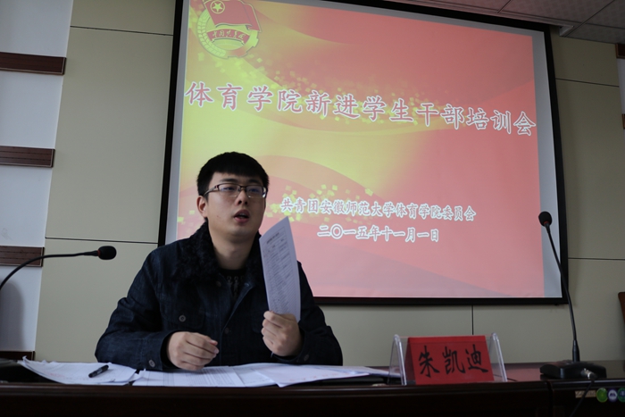 培训会上,朱凯迪首先介绍了团委书记的职责和团学组织员工干部的职责,他从“常规工作、重点工作、特色工作”三点介绍了团、学组织的工作情况,希望同学们发扬体院特色,鼓励同学们运用新媒体加强宣传,促进团学工作全面发展。最后,朱凯迪用“责任与使命、能力与品德、执行与思考”等问题明确团、学干部身上的责任和义务,勉励同学们要慎言慎行,从严要求自己,更好地实现自我超越。