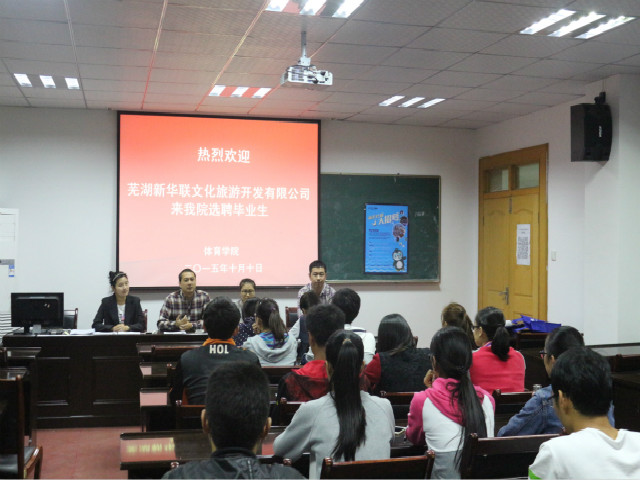 据悉,芜湖新华联旅游开发有限公司作为中国500强企业——新华联控股有限公司控股的房地产开发企业,于2011年成功上市,打造了中国第一座第五代海洋极地馆——芜湖大白鲸海洋公园等一批国内顶级休闲旅游项目,本次进校宣讲招聘主要涉及储备经理、督导、海洋生物表演等岗位。