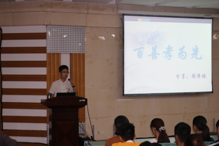 讲座由手语舞蹈表演引出主题——百善孝为先。周老师提出:“人生在世诸事不顺皆因不孝”,同时从孝之反思、孝之感恩、孝之实践、孝之忏悔四个环节来展开讲座。讲座中,周老师通过多个视频来向同学们展示“孝”之道。视频《驴子孝》,浓浓真情反思自我;《烛光里的妈妈》深深爱意感恩父母;《为妈妈洗脚》孝之实际回报父母;《跪羊图》忏悔自我答谢父母。在讲座结束之际,董满秀老师和部分员工自发上台表露真情,表达自己在生活中对父母的诸多歉意,员工也表示自己今后会努力学习,回报父母恩情。