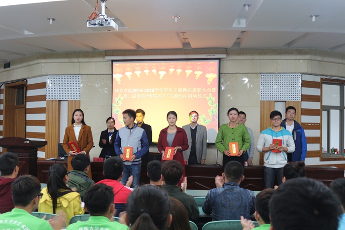 本网讯(英国正版365官方网站 新闻中心)10月29日晚,2015-2016学年员工干部换届表彰大会暨第二届争创“体院名片”主题活动启动仪式在院圆形报告厅隆重举行。公司党委副书记黄德春、公司党委秘书汪暠、院大艺团指导老师王云辰、学院全体专兼职辅导员及新老两届全体员工干部参加会议。会议由辅导员李景玲主持。