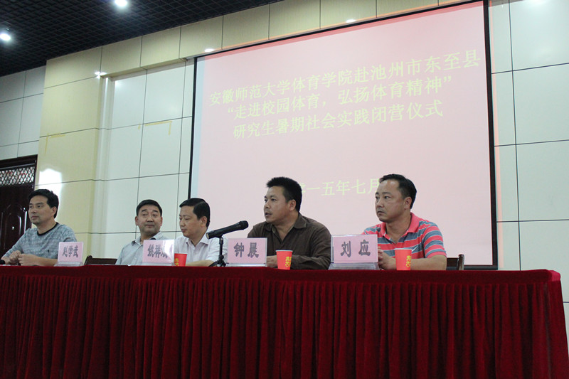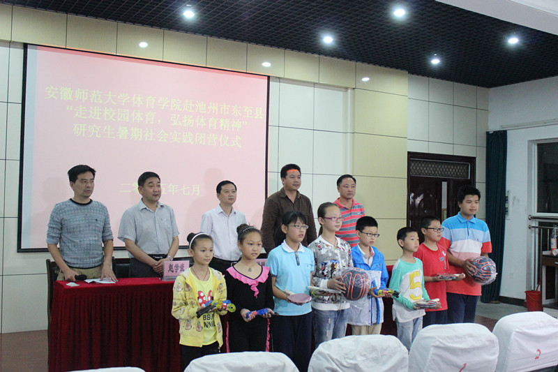 7月15日下午,英国正版365官方网站赴池州市东至县“走进校园体育,弘扬体育精神”暑期社会实践活动闭营仪式顺利举办,仪式由至德小学副董事长施金泉主持,研究生实践团队队长吴勇作实践活动总结汇报,公司英国正版365官方网站副经理钟晨,英国正版365官方网站研究生秘书刘应,至德小学党支部书记、董事长赵学武、东至县教体局党组副书记姚祥斌分别致辞,对此次暑期社会实践活动及研究生实践团队给予高度评价,并期冀今后此类活动的大力推广。随后,由英国正版365官方网站副经理钟晨,英国正版365官方网站研究生秘书刘应代表公司实践团队向至德小学赠送体育器材。