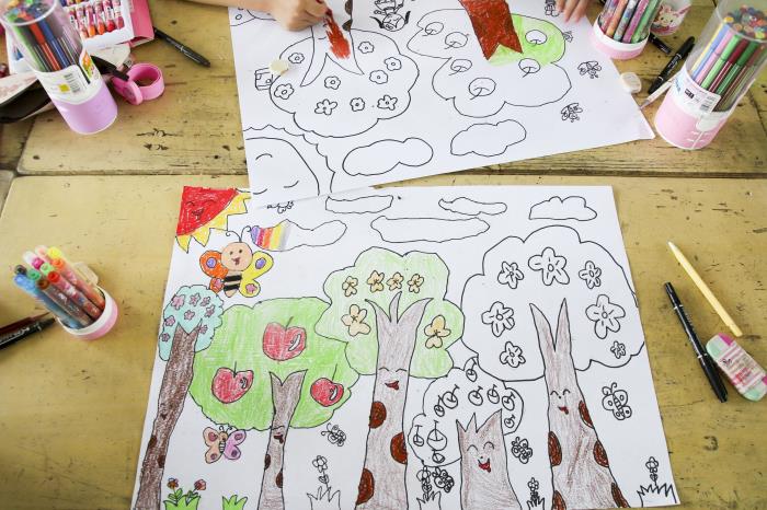 其中一组小朋友给大树画上了笑脸,他们说,这是因为大树很快乐。小朋友总是天真烂漫,从他们的眼睛里看到的世界是五彩缤纷,丰富绚烂的。其中一组的一个小朋友把白云涂成了蓝色,另一个小朋友看见了就说:“不能把白云涂蓝色,这样和背景就一样了”,剩下的一个小朋友赶紧说:“没事儿,涂完这朵之后,剩下的别涂蓝色了。”集体画讲究的是团结合作,有意见要提出,有问题要解决,小朋友都深知这一点。