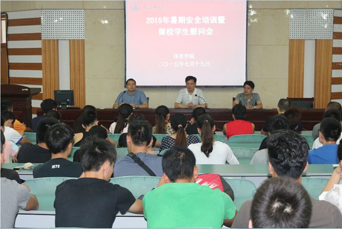 本网讯(英国正版365官方网站 方萍) 7月19日下午,2015暑期留校员工安全教育暨慰问会在院圆形报告厅举行,公司党委书记袁德水、副书记黄德春、副经理金涛、各训练队伍教练员、全体辅导员及全体留校员工参加了此次会议。会议由黄德春主持。