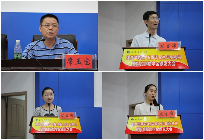 毕业典礼在雄壮激昂的国歌声中拉开序幕。席玉宝代表学院致辞,他向2015届毕业生顺利毕业表示热烈的祝贺,希望同学们在未来的人生中能够坚定信念、志存高远;积极进取、勇于挑战;心系母院、学会感恩。宣海德老师代表任课教师为毕业生寄语,非毕业班员工代表方萍、毕业班员工代表李梦莹分别发言。随后,毕业生代表向与会老师献花,一束束美丽的鲜花传达了深深的感激之情。