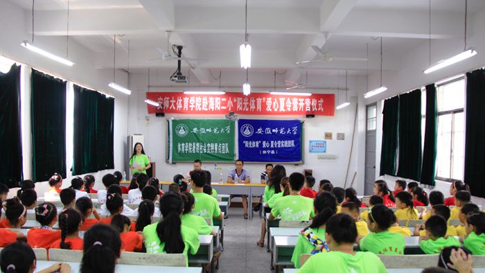 本网讯(英国正版365官方网站团委)又是一年七月,又是一年相聚,英国正版365官方网站阳光体育夏令营爱心支教团队第三次走进黄山休宁海阳二小。2015年7月14日上午9时整,夏令营开营仪式在多媒体教室拉开了帷幕。与会人员有休宁县县团委副书记方程、休宁县教育局教研室体育教研员胡志宏、休宁县海阳二小副董事长程强武、阳光体育爱心夏令营的全体志愿者和小营员。