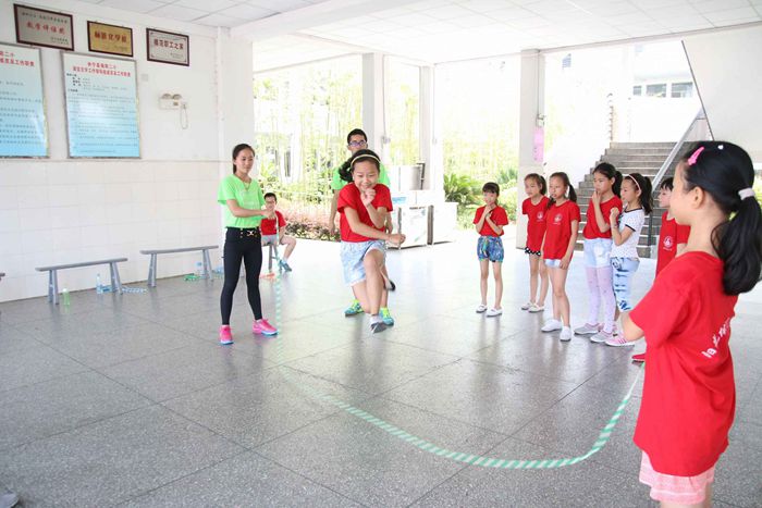 跳绳班的孩子俩个人一组练起了跳绳,去年,他们参加了爱心夏令营的舞蹈班。吕金凤看着跳绳的孩子们笑着说:“孩子们基础特别好,学的也很快,教学进度很快,他们热情很高,即使满头大汗,让他们休息,他们最多去喝水然后回来继续跳绳,孩子们才是我们的老师。”满满的自豪感不言而喻。环顾跳绳的场地,发现有一位脸色通红的小营员在旁边休息。“她有点不舒服,刚用冷水洗了脸,在一边休息一会儿”。老师轻声询问左佳薇下午是不是要在家里休息,她却摇了摇头说,自己下午还要过来上课。