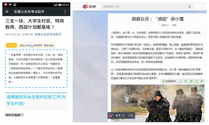 充分宣传,营造就业氛围 毕业班辅导员每天利用微博、微信等平台推送老员工村官、三支一扶、西部计划、应征入伍等相关政策,充分利用新媒体等平台,推送学院优秀应征入伍员工、军中“虎妞”佘小雪等典型事迹,充分营造就业氛围。