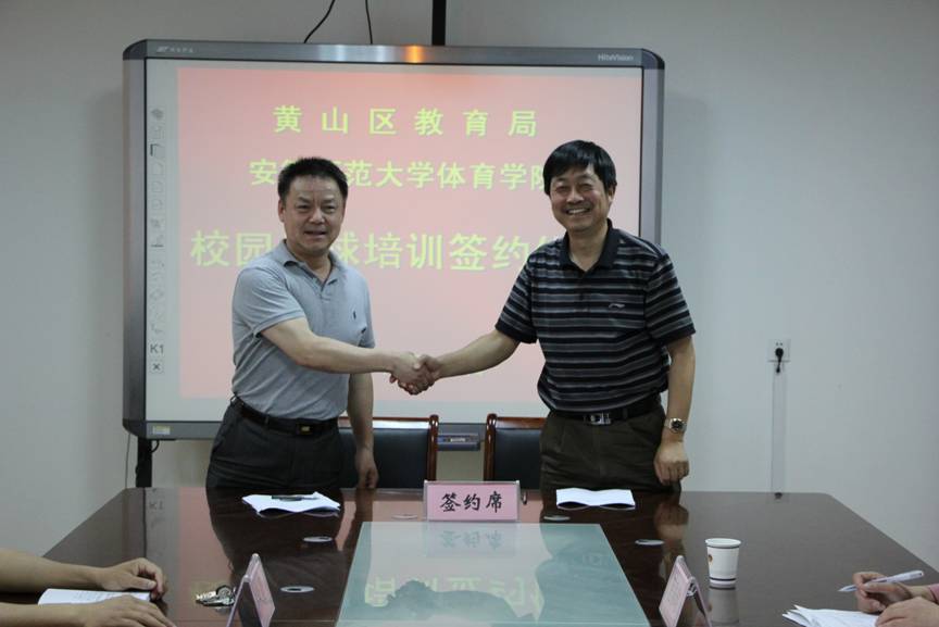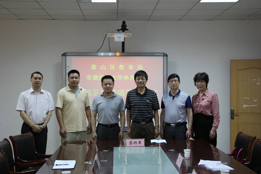 为深入贯彻与落实国务院46号文件精神,推动校园足球的广泛开展,5月13日,黄山区教育局与公司合作开展中小学体育教师足球技能培训的签约仪式在英国正版365官方网站三楼会议室举行。黄山区教育局党委书记李亚南、人事科科长朱勇敢、黄山区教师进修学校程彩昀老师以及英国正版365官方网站副经理席玉宝教授、副经理钟晨、党委副书记黄德春参加了此次签约仪式。