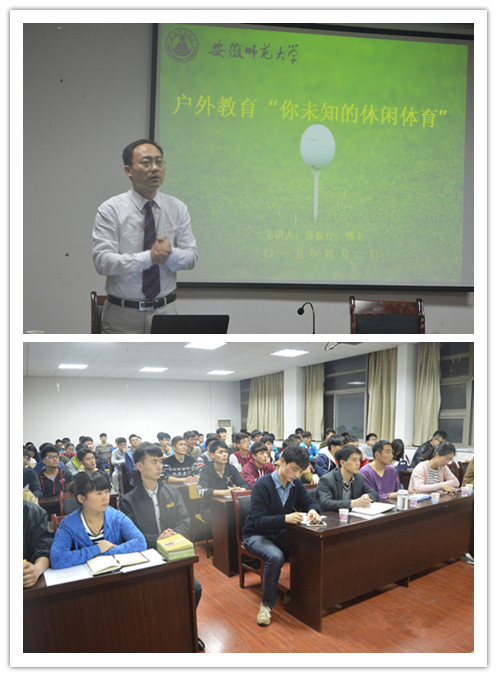 学术讲座,学院促进理论教育。任何教育都离不开理论教学,在学院支持下,邀请薛保红到公司为休闲体育的同学们做了一次学术报告,让同学们了解到什么是体验式教育。讲座中,薛保红首先以一个游戏开始,结合自身的学习工作经验,深入浅出的向在场的师生们介绍了休闲体育健康、文化产业的发展,结合六个名词即“教育、体育、户外、休闲、户外教育、休闲体育”并且向大家全面的解释了各个名词的含义以及结合这些名词对自己未来发展的意义。接着,他结合自身的成功的学习经验,用视频来向大家展示各种各样的休闲体育活动,帮助同学们认识休闲体育,从中学习到更多的理论知识。最后结合休闲体育的专业特色向同学们介绍不同的职业定位,给予同学们“理论与实践相结合、传统与时尚相结合、校内与企业单位同步推进、素质提升与证书考取相结合、投入与收获成正比、冒险与机遇并存。”六点建议,同时邀请同学们可以参加他组织的体验教育活动,为未来的发展做出铺垫。