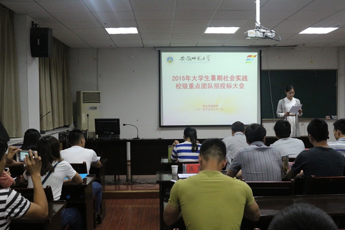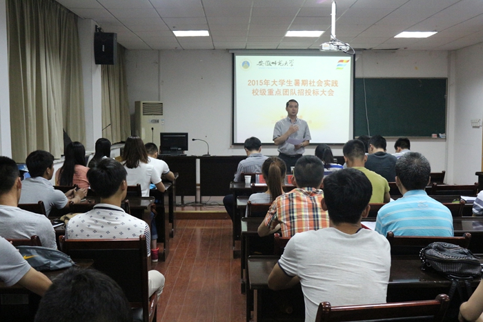 本网讯(文/朱莹 摄/周万峰)实践出真知,实践长才干。一年一度的暑期社会实践活动又将开始, 5月21日晚,由学院团委主办的2015年暑期社会实践校级重点团队招投标大会在院行政楼二楼会议室顺利召开。公司党委副书记黄德春、院团委副书记朱凯迪及全体辅导员老师出席了此次招标活动并担任评委。来自全院27支实践队伍参加了此次投标大会。