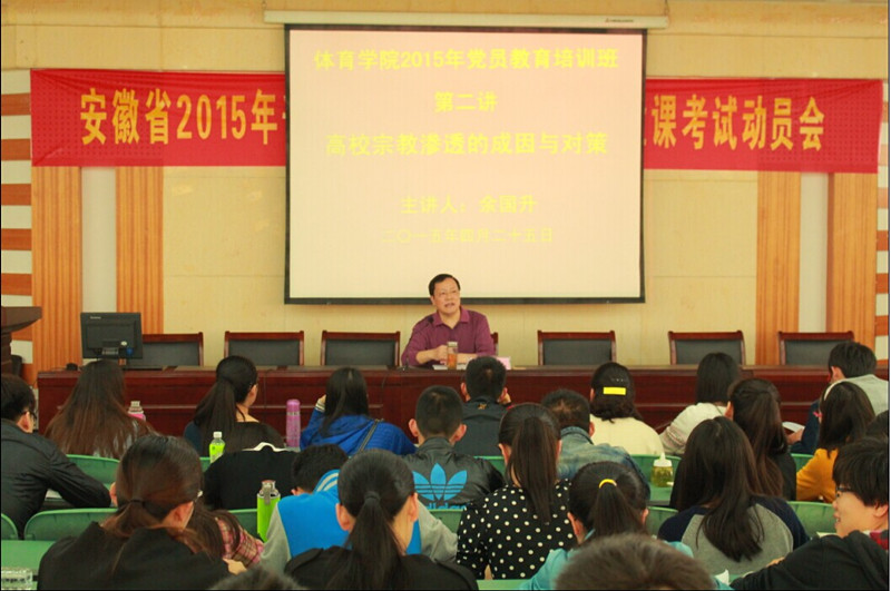 本网讯(英国正版365官方网站 汪暠 方萍) 4月25日上午,在英国正版365官方网站二楼圆形报告厅,公司党委统战部部长余国升应邀为公司师生作《高校宗教渗透的成因分析及应对策略》专题讲座。公司党委副书记黄德春、各年级辅导员及本科生、研究生骨干到场聆听。讲座由公司党委秘书汪暠主持。