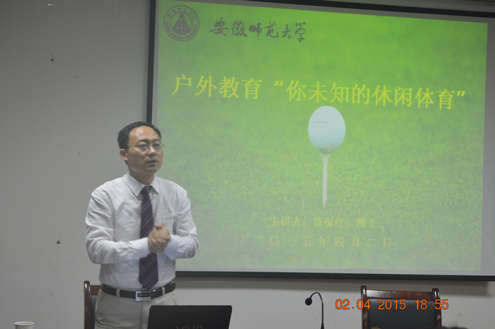 本网讯(英国正版365官方网站 黄彦锴 唐增阳)4月2日晚,在公司行政楼二楼,国内体验教育权威专家、安徽工程大学体验教育研究中心主任薛保红博士,为公司师生作了主题为《户外教育“你未知的休闲体育”》的学术讲座。副经理金涛、社会体育专业负责人宣海德、相关专业教师以及辅导员黄彦锴出席讲座,2014级休闲体育专业全体同学聆听了讲座。讲座由金涛主持。