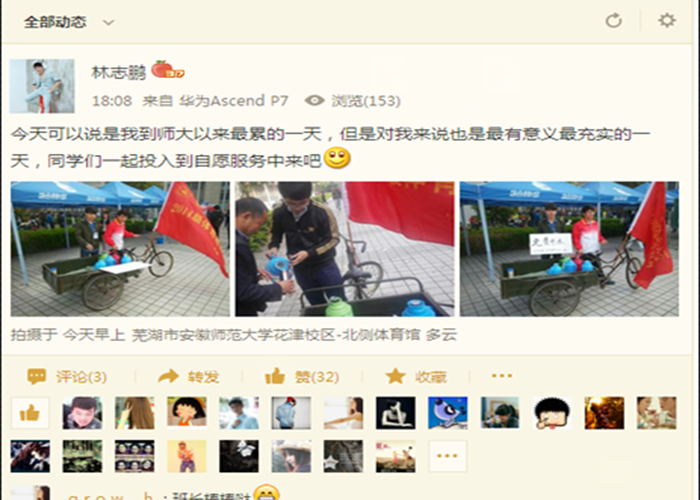活动当晚班长在QQ中留言到:“今天可以说是我到师大以来最累的一天,但是对我来说也是最有意义最充实的一天,同学们一起投入到自愿服务中来吧!”