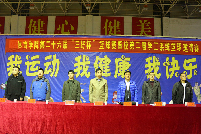 下午4点半,伴随着运动员进行曲,员工代表队在班级辅导员的带领下和教工代表队依次有序进入赛场。在庄重的国歌声中,开幕式正式拉开帷幕。袁德水为开幕式致辞,他简要介绍了学院“三好杯”篮球赛的由来以及本项赛事在体院师生中的突出位置。他指出“三好杯”篮球赛参与人数多,影响范围广,品牌效应越来越强,希望全体运动员发扬“更高、更快、更强”的体育精神,文明竞赛,顽强拼搏,赛出风格,赛出水平,争取优异成绩;希望裁判员和工作人员,恪尽职守,公正执裁,热情服务,努力把本届篮球赛办成团结、友谊、文明、和谐的盛会。裁判员代表和运动员代表宣誓后,袁德水宣布开幕。